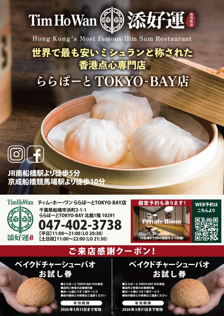 こんにちは!千葉みらいポスティングです。 千葉県船橋市で点心専門店様よりポスティングのご依頼をいただきました! 〇お客様情報(敬称略)ティムホーワン ららぽーとTOKYO-BAY住所:千葉県船橋市浜町2-1-1ららぽーと …